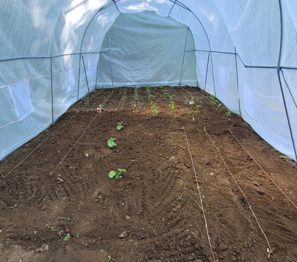 We had a run of gorgeous weather. 70’s and 80’s. Bright beautiful days. Sounds great right? Well I decided we were in the clear for snow at this point and my greenhouse areas were freshly tilled and the soil amended. I thought it would be a great time to put the covers on the greenhouses and let the soil warm up. We did. That was last Sunday. I vaguely said to my husband that we should stake down the greenhouses, he replied yes but we just didn’t get it done Sunday. Well Sunday night it rained, and the winds came…you know where this is going right? Woke up Monday to one of the greenhouses upside down in the woods and the other upright but just turned sideways. They were fine, just needed to be put back into place. Hubby went off to work and my son and I put everything to rights, staking everything down this time, putting heavy rocks on the perimeters. They were secure, not going anywhere!