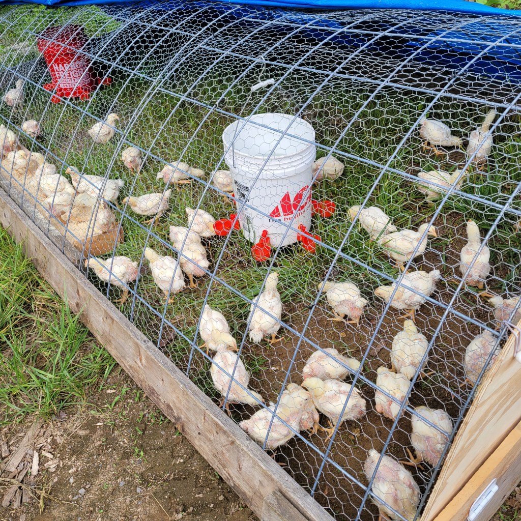 Our meat chickens are finnaly outside in the run we built them. We’ll butcher then Aug 7&8. All 48 of them. We sadly lost a few but thats typical.